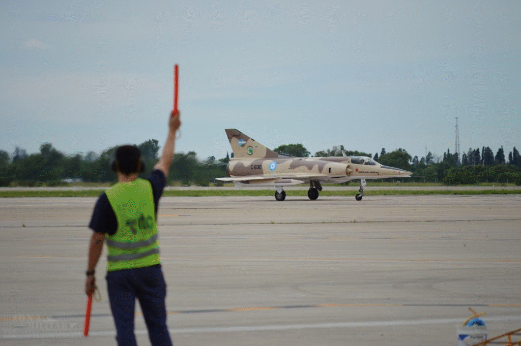 El tan esperado arribo del Mirage V-P Mara se daría aproximadamente a las 1140hs. Bajo el indicativo “Rifle”, el delta realizaría dos sobrevuelos rasantes sobre la pista 18/36 del aeropuerto cordobés, tomando por sorpresa a mas de un fotógrafo y cronista presente (previamente había realizado una maniobra similar sobre la ciudad).